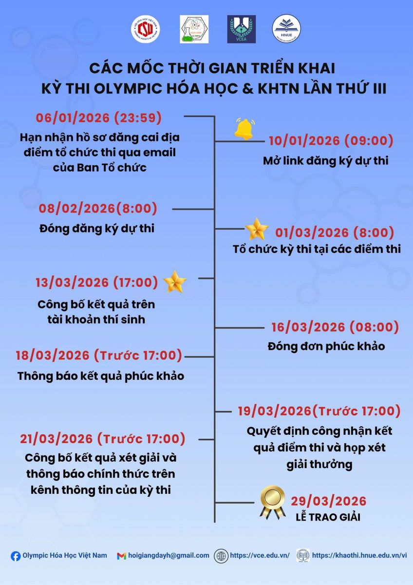Ban Tổ chức trân trọng thông báo các mốc thời gian chính thức trong lộ trình triển khai Kỳ thi Olympic Khoa học Tự nhiên & Hóa học lần thứ 3 - năm 2026 nhằm giúp thí sinh, phụ huynh và đơn vị tham gia chủ động theo dõi, chuẩn bị và sắp xếp kế hoạch phù hợp.
