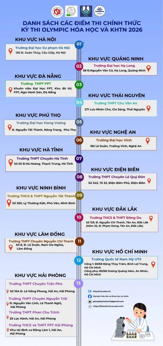 DANH SÁCH CÁC ĐIỂM THI CHÍNH THỨC KỲ THI OLYMPIC HOÁ HỌC VÀ KHOA HỌC TỰ NHIÊN LẦN THỨ III - NĂM 2026